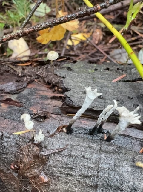 I met some bracket fungus that miiiight be a turkey tail. Definitely met Xylaria hypozylon, who is also called candlesnuff fungus, stag's horn fungus, and carbon antlers. There was an astonishing creature named, I kid you not, someone called purple jellydrops. Someone who is possibly an amethyst deceiver? Someone who might be a poisonous sulfur tuft or might be an edible conifer tuft; the difference is in the gills and I just enjoyed looking at them from above. I'm not looking for food yet; at this point I'm mostly just learning the names of my beautiful neighbors.