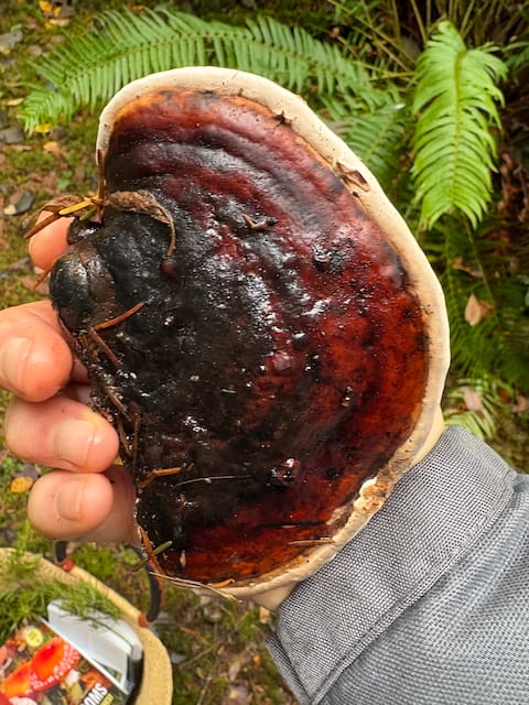 I tromped down through the meadow into the forest, wearing my pajamas and galoshes and carrying a basket of books, phone, and knife, in order to harvest a mushroom. I'd found a log colonized by red-belted conk, fomitopsis pinicola, on the old logging road and I was aiming to make my first mushroom tincture. Red-belted conk has benefits similar to reishi, there's nobody dangerous who is easily mistaken for them, and I sent a photo to a mushroom foragers group to get verification from others. It seemed like a solid place to begin.