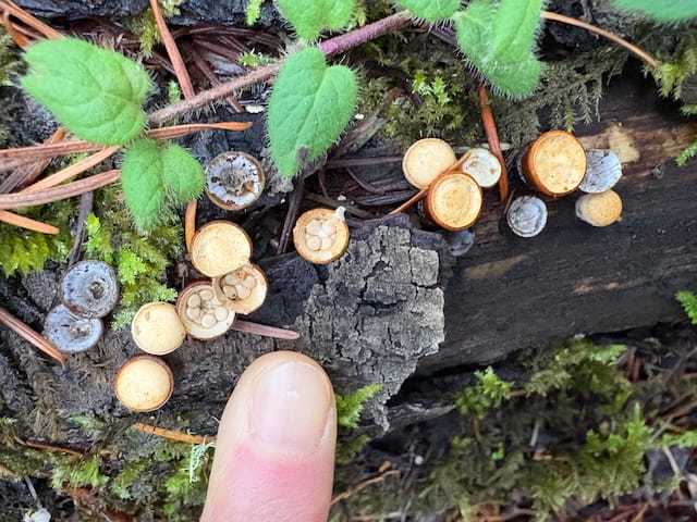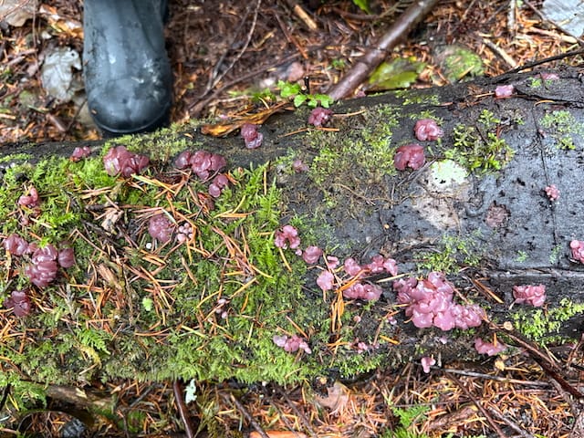 Encountering more intimately all of this life that is happening right beneath my feet has enriched my perception of the forest. The life the forest is entwining everywhere. Life and death are inseparable, nourishing one another all around. Perhaps you have heard that trees use mycelial networks to share nutrients with one another? I've heard folks describe this in one sort of anthropomorphic way as if the trees were using the fungi as a tool. I've heard folks describe this in another sort of anthropomorphic way as the fungi farming the trees. Truly, though, this relationship is symbiotic, mutually beneficial; these beings are interdependent. And that is the world I want to live in: one where we do not focus on power-over, but on mutuality.