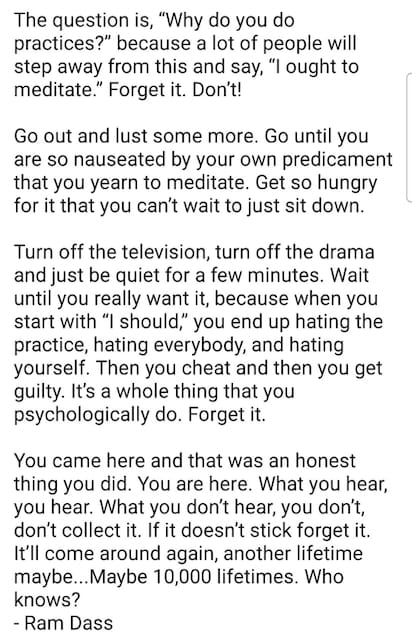 Last week my opening essay was about following our longing toward that which we desire more of in our lives. Jessica kindly shared these words of Ram Das's, which resonated with that for her. I adore Ram Das. I do not share his belief in reincarnation. I'm not opposed to it; I am simply agnostic about the nature of existence; adamantly, vigorously, agnostic: I practice wondering, finding the edges of what I know, dismantling my certainties. This means I feel a little more interest in coming to practice now than Ram Das does – I can't assume we've got 10,000 lifetimes. Where we absolutely agree is in following your longing toward that which calls to you, that wish you wish to have in your life.