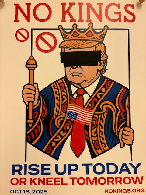 I asked my darling husband James if he'd consider turning the excellent protest sign he made for the June No Kings rally into a flyer to help folks learn about the next one on October 18 for my temple. He did! You can download it here, too, if you wish. Someone mentioned that seeing That Man's face across the room on the bulletin board during yoga was a bummer, so I taped over it, which, gotta say, was satisfying. You can do it your way. Let's get into the streets!