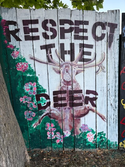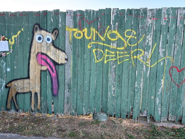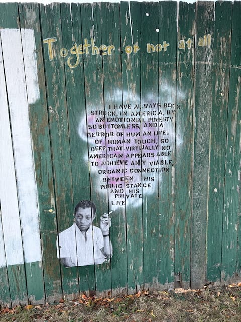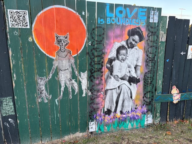 There is painting, stencil, collage, and poetry. There is work by children and adults. There is joyful art, mournful art, reverent art, irreverent art. This expanse of public artist expression has been met with widespread enthusiasm. The fence clearly has to go, but people want the art to stay, which has me feeling hopeful about the future of public art in our community. Art – particularly imperfect and inexpert art! – feels extra potent right now because joy and personal expression are delicious ways to undermine the dreary monotonous conformity beloved of fascism. The piece of art that heads this missive was my favorite on the day I first walked through; I imagine that might change as there is so much to love! Goodness, though, what a glorious piece that is. I cannot look at it without smiling.