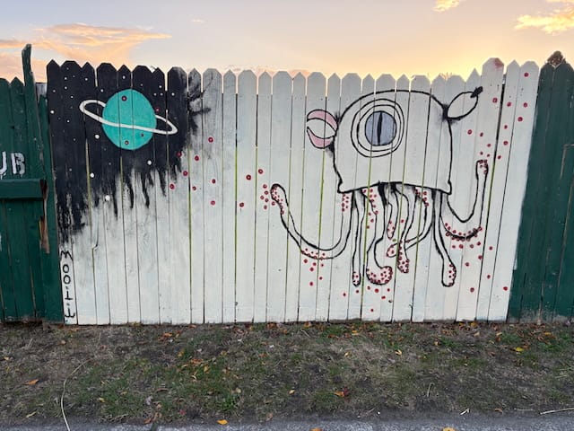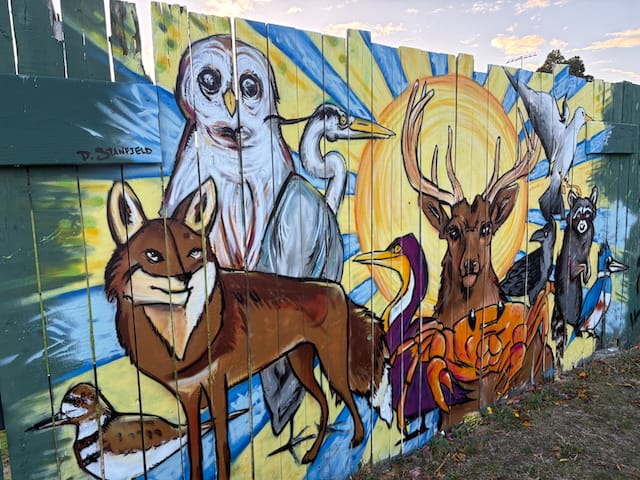 There's a ratty old fence around the athletic field in town; it's due to be replaced in the spring. One woman, Alex Anagnostopoulos, got a bee in her bonnet about the possibility of making public art here and spent two years diligently working to bring about the Outsiders Street Art Project Port Townsend, the first community public art project to be approved by the my county. Apparently the fact that the site is county land within the city made it extra complex to get all the needed approvals. Nevertheless, she persisted (I couldn't resist!), and now there is a three-block-long canvas awash with the art of my neighbors in the middle of town.
