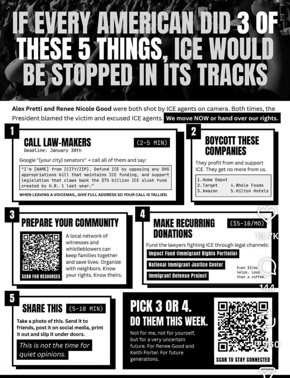 The 3.5% rule was formed by Erica Chenoweth, a political scientist who observed that when this small percentage of the population of a country protests nonviolently against an authoritarian government, that is the threshold at which they are likely to fall from power. This number is so small. You can be part of this. Anything you want to do can be a part of this. Sing in the streets, knit, be a nuisance, join your local ICE patrol, curl up by the couch to write letters. Every resistance action matters. Talk to your friends and family. Invite anyone you can along. This is a moment of grief and rage, but also a moment of tremendous possibility.