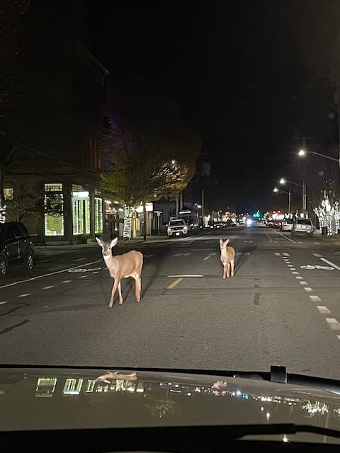 We had just turned onto the big hill behind the grocery store, done with shopping for the week, heading home. It was early evening, pitch dark. James hit the gas and suddenly I was shouting: "THIS IS TOO FAST IT IS NOT OKAY!" We were both shocked by my sudden vehemence and volume. James slowed and asked what was going on: he had accelerated quickly, but only to the speed limit in town, and being yelled at was not great! I began to reply, “Oh my gosh, I’m so sorry; that was awful, I don’t know wha – DEER ON THE RIGHT!!”